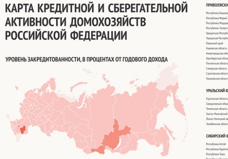 Согласно исследованию проекта ОНФ «За права заемщиков» самыми закредитованными регионами страны оказались Тыва (78%), Калмыкия (64%), Удмуртия (50%), Чувашия (50%) и Ленинградская область (50%).