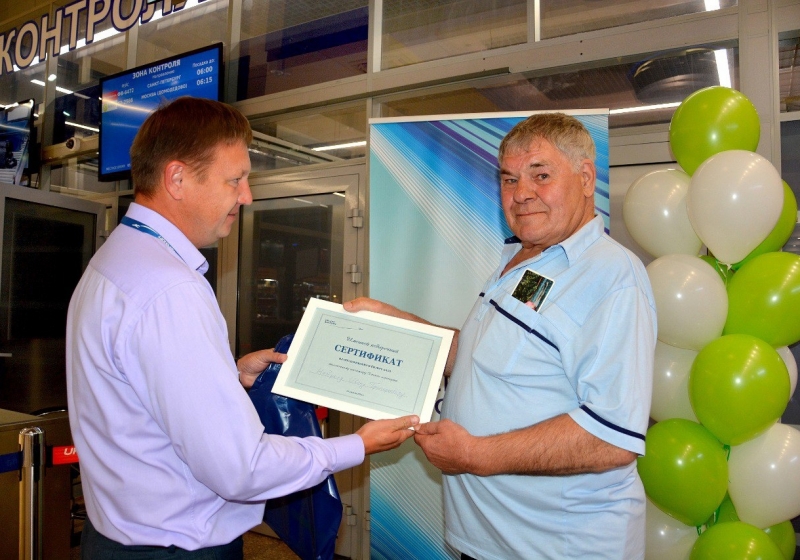 В этом году радостное событие случилось значительно раньше чем в прошлом. Счастливчику — Ивану Нейфельду из Германии — вручили сертификат на бесплатное обслуживание в бизнес-зале аэропорта и на бесплатный перелёт Москва-Омск-Москва от авиакомпании.