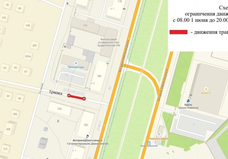 Для проведения ремонтных работ на подземных инженерных коммуникациях тепловых сетей будет прекращено движения транспортных средств с 8:00 часов 1 июня до 20:00 15 октября по улице Ермака, на участке дороги от жилого дома № 182 по улице Богдана Хмельницкого до жилого дома «163 по улице 9-я Линия.