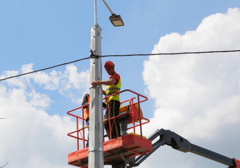 Вдоль дороги уже установлены опоры — они совмещённые, т.е предусмотрены и для монтажа подвески контактной сети, и для установки светильников. На них уже навешивают хомуты для крепления консолей. Работы проводит специализированная организация из Самары, генподрядчик.
