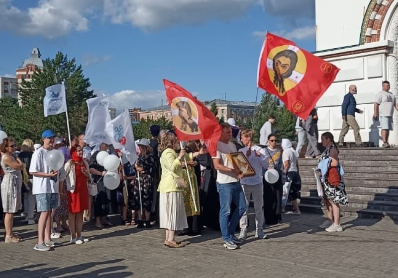 Сегодня в омском храме святых Петра и Февронии Муромских состоялась божественная литургия, а после православные верующие прошли крестным ходом по улице Ленина в рамках Всероссийского парада семьи, который прошел от Успенского Кафедрального Собора до Свято-Никольского Казачьего собора.