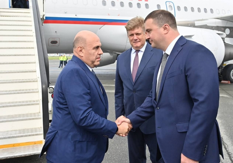 Омск, Россия — Председатель Правительства Российской Федерации Михаил Мишустин прибыл в Омскую область сегодня с рабочим визитом. У трапа самолета премьер-министра встречали губернатор Омской области Виталий Хоценко и полномочный представитель Президента Российской Федерации в Сибирском федеральном округе Анатолий Серышев.