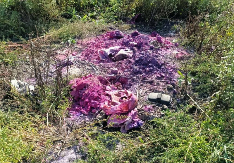 В ходе проверки, проведенной совместно со специалистами Россельхознадзора, на площади 34 квадратных метра были обнаружены химические вещества красно-фиолетового цвета, складированные непосредственно на плодородном слое почвы.