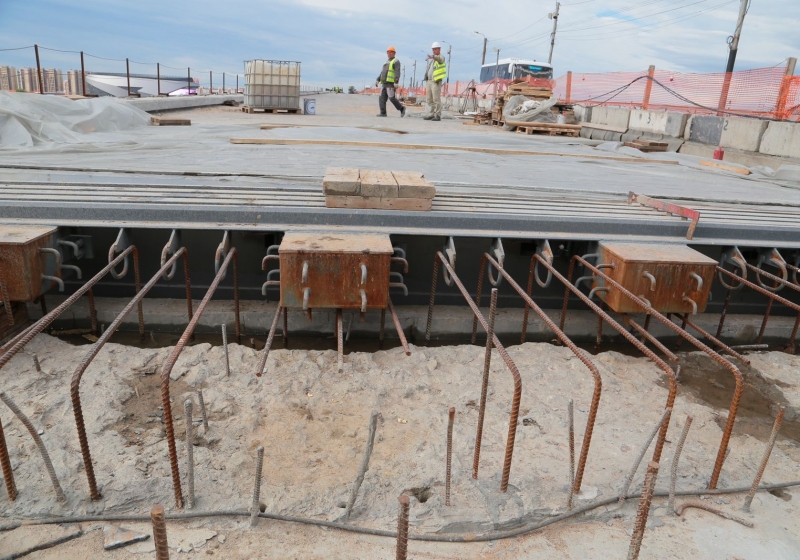 Монтаж новых конструкций ведется поэтапно: сначала на одной половине моста, затем, после возобновления движения, на другой. Новый шов надежно соединяется с арматурным каркасом пролетного строения и заливается бетонной смесью.