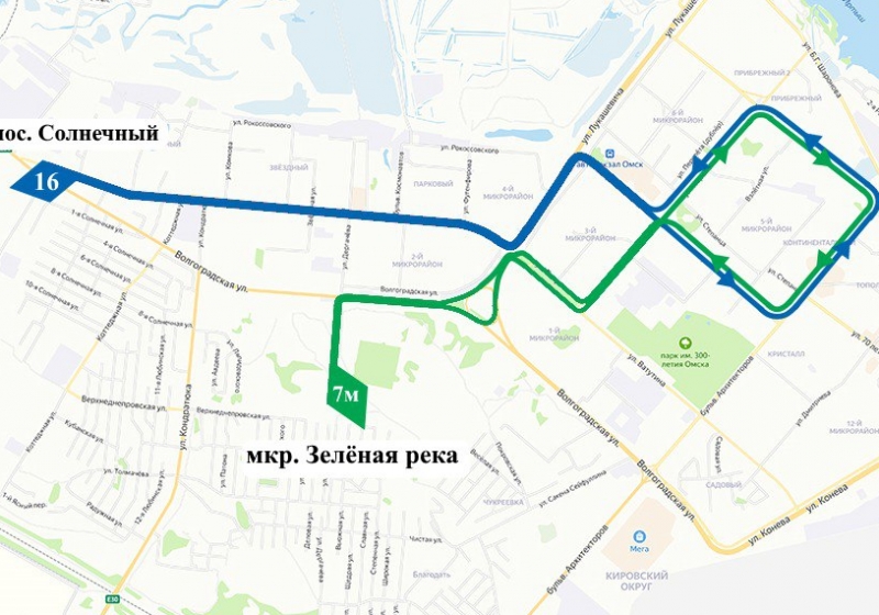 - Троллейбус № 7м: При движении от микрорайона «Зелёная река» до остановки «Архитектурная» троллейбус следует по улицам Волгоградской, Ватутина, Перелёта, Крупской, бульвару Архитекторов, проспекту Комарова и далее.