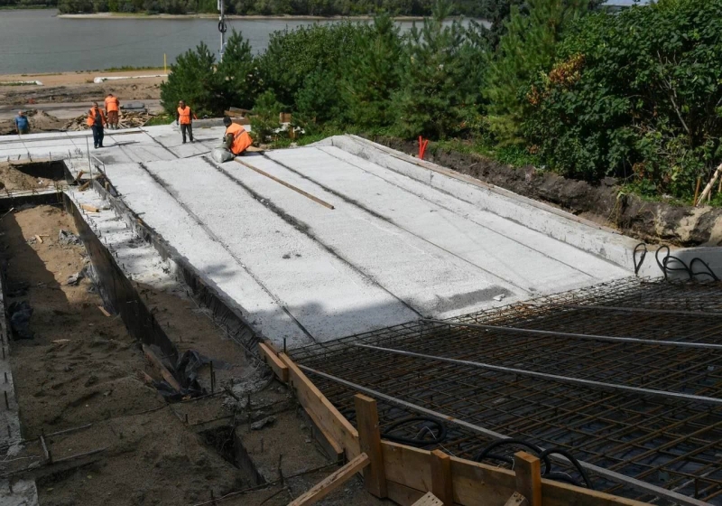 Проект нового общественного пространства в Омске можно условно разделить на три части: обновление лестницы, небольшого сквера на пути к пляжу и пляжную зону. Подрядная организация выполнила демонтаж и полный разбор старых покрытий лестницы по ул. Короленко. Сейчас ведутся работы по бетонированию оснований лестницы.