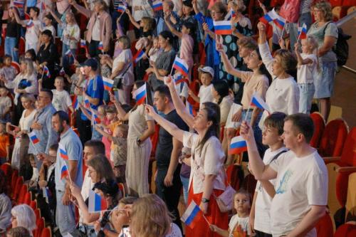 Так, под исполнение гимна страны дети из Омского государственного ансамбля и артисты шоу «Империя львиц» вместе с публикой подняли 1 600 флагов. А в финале представления — развернули два полотна в цветах триколора площадью по 480 квадратных метров.