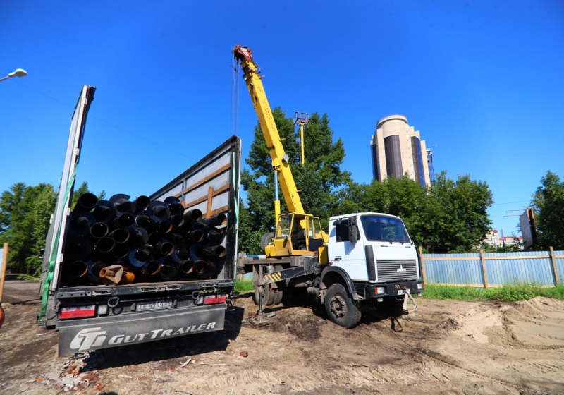 Сейчас спецмашины вывозят с площадки лишний грунт.