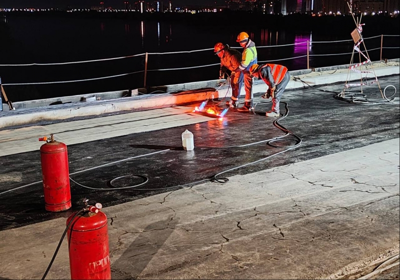 Стоит сказать, что подрядчик использует продукцию одного из ведущих российских производителей строительных материалов. В ходе работ рулонная гидроизоляция наплавляется на очищенную, выровненную и покрытую специальным праймером поверхность плиты.