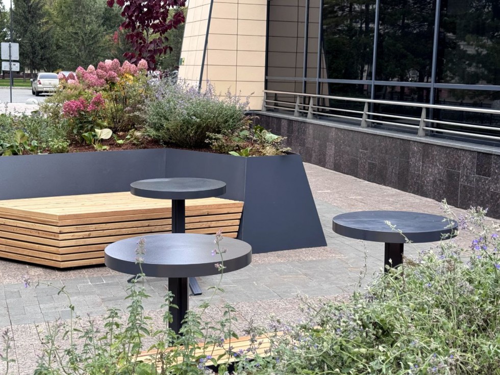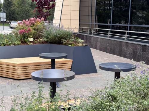 Зеленая зона украшена цветущими гортензиями и молодыми деревьями, создавая спокойную атмосферу в самом центре мегаполиса-миллионника.