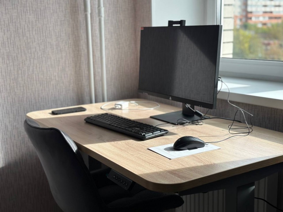 Рабочее место с регулируемой высотой стола оснащено компьютером, планшетом и умной колонкой — всё это облегчает выполнение повседневных задач.