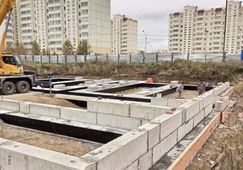 На данный момент на строительной площадке ведутся активные работы: формируется фундамент здания, осуществляется установка опалубки, армирование и гидроизоляционные мероприятия. Также началась укладка фундаментных блоков стен подвала.
