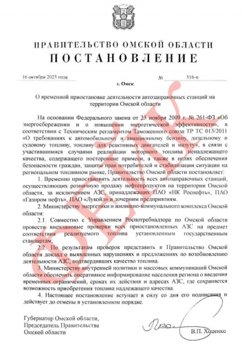 Омичи обратили внимание на появление в соцсетях документа о закрытии в регионе АЗС. В частности, распространялось постановление, подписанное губернатором Омской области.