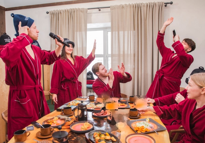VIP-кабинет для индивидуального отдыха рассчитан на компанию до 10 человек. В стоимость оплаты кабинета включен полный набор банных принадлежностей: халаты, полотенца, тапочки, шапки и килты. Для удобства гостей в кабинете есть комфортные индивидуальные раздевалки и туалетная комната.