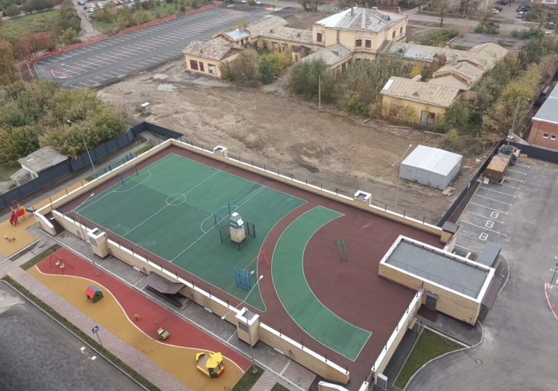 В Ленинском административном округе Омска, недалеко от железнодорожного вокзала, в микрорайоне Привокзальный, возвели 14-этажный жилой дом. Судя по фото, рядом с домом — подземный паркинг, на крыше которого расположена детская игровая зона с футбольной площадкой.