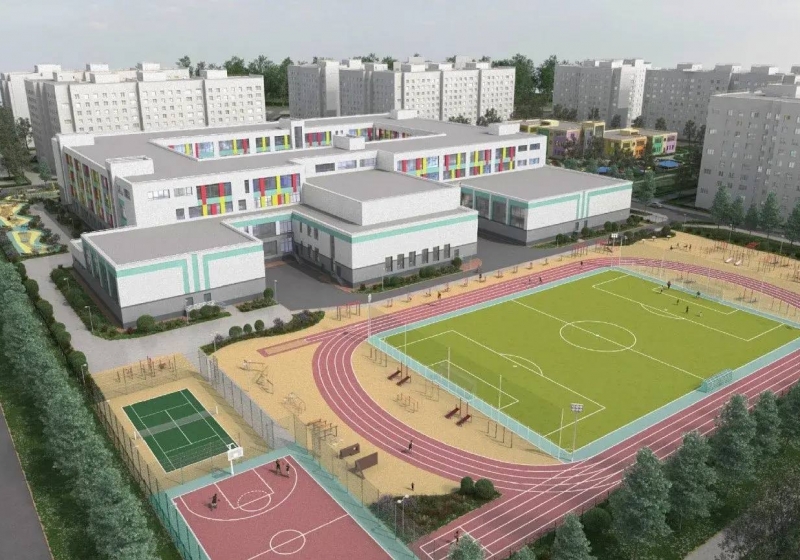 На территории школы разместят футбольное поле, круговую беговую дорожку, площадки для прыжков в длину, волейбола и баскетбола, а также универсальные для общефизической подготовки и физкультурно-оздоровительных занятий. Во внутреннем дворике — зону для общешкольных мероприятий и места тихого отдыха.