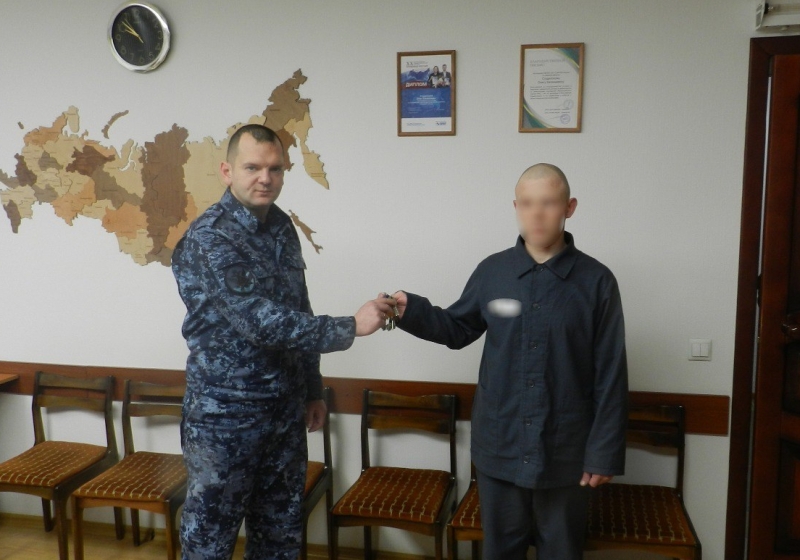 Начальник учреждения Олег Студитский торжественно передал осужденному ключи от квартиры, которую он ожидал более 15 лет.