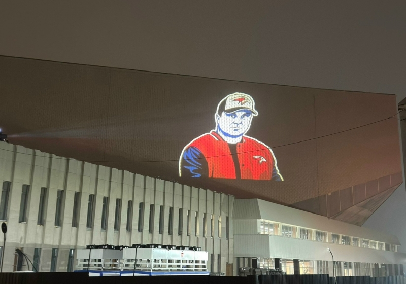 На здании спортивного комплекса в Омске появилась проекция, на которой был изображен губернатор. Глава региона изображен в атрибутике ХК «Авангард».