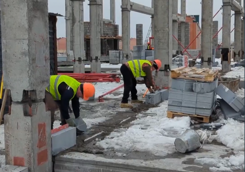 На текущий момент на строительной площадке активно возводят коробку здания. Работы ведутся с высокой интенсивностью: железобетонные элементы каркаса поступают напрямую с завода, что позволяет не снижать темпы строительства. Бригада выполняет монтаж конструкций, одновременно ведётся кирпичная кладка несущих и ограждающих элементов второго этажа, а также установка внутренних перегородок.