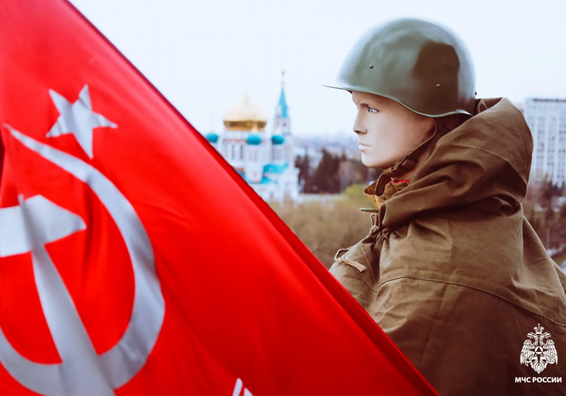Ко Дню Победы образ пожарного Василия, размещённого на омской каланче, по уже сложившейся многолетней традиции переодели в военную форму советского солдата.