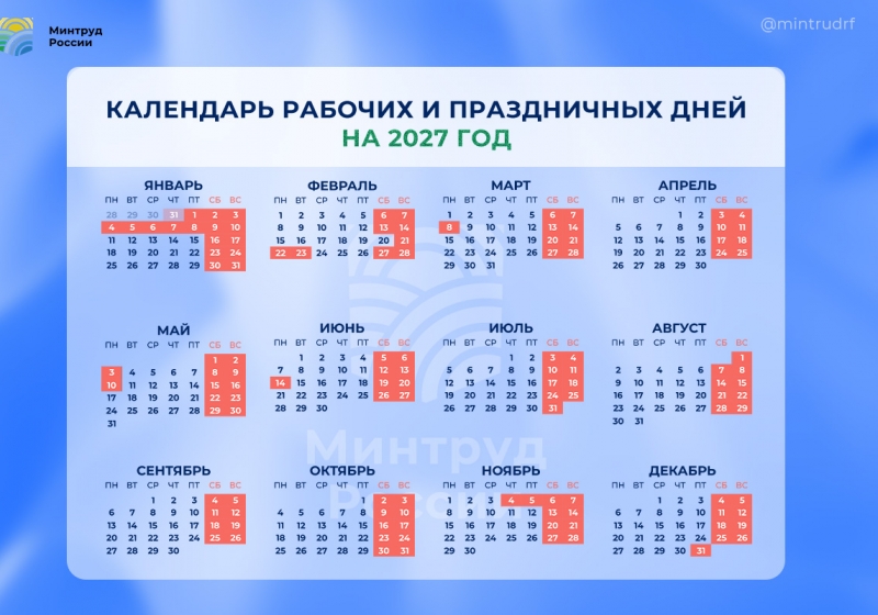 Стал известен календарь выходных и праздничных дней на 2027 года. Проект постановления опубликован Минтруда РФ для общественного обсуждения.