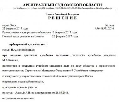 Дело рассматривается в арбитражном суде города Москвы. Судебное заседание состоялось 01.02.2017 года. Юриста омского Департамента в суде не было.