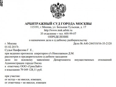 Дело рассматривается в арбитражном суде города Москвы. Судебное заседание состоялось 01.02.2017 года. Юриста омского Департамента в суде не было.