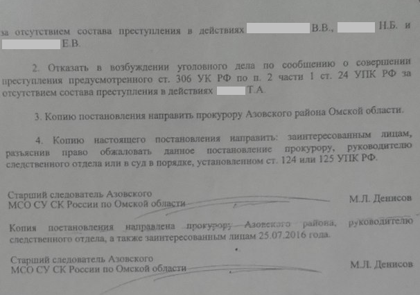 Серьезным ударом стал уже упомянутый отказ следователей Азовского межрайонного следственного отдела СУ СК РФ в возбуждении в отношении медиков больницы уголовных дел по ч.2 ст. 109 и ч.2. ст.293 УК РФ. Соответственно – «Причинение смерти по неосторожности вследствие ненадлежащего исполнения лицом своих профессиональных обязанностей» и «Халатность, повлекшая по неосторожности причинение тяжкого вреда здоровью или смерть человека».