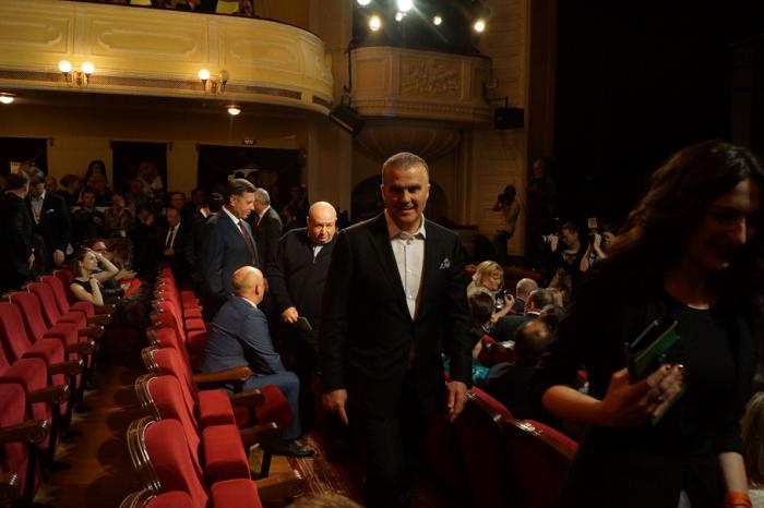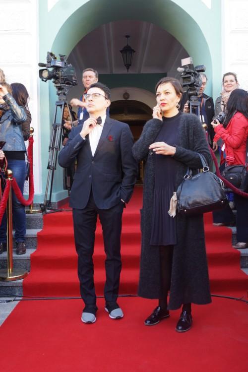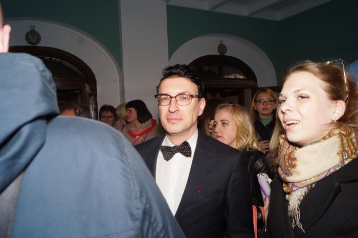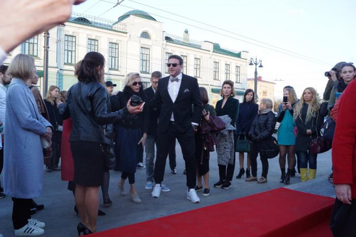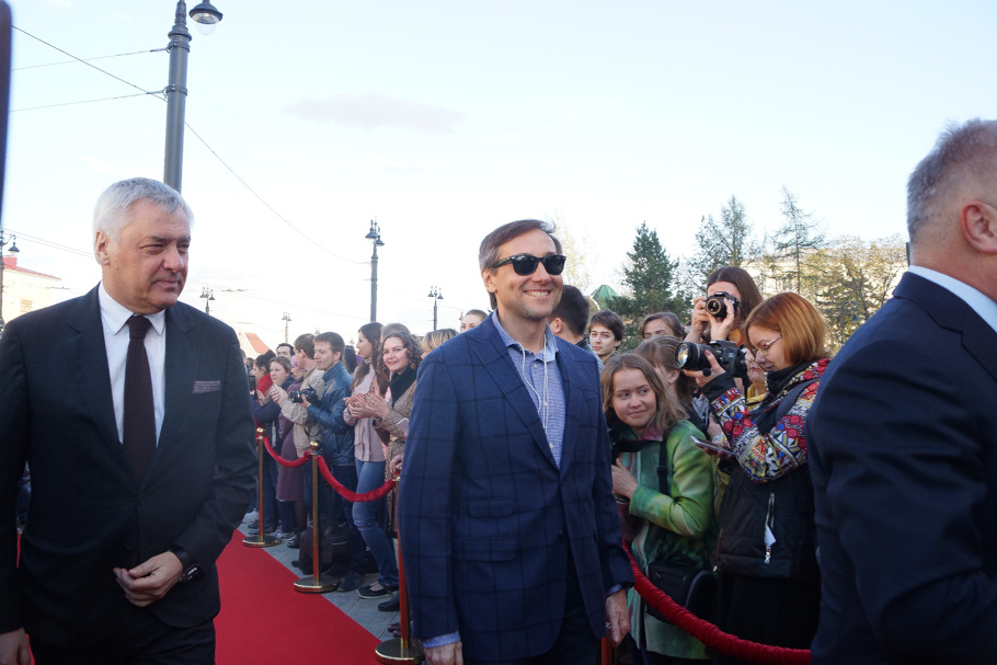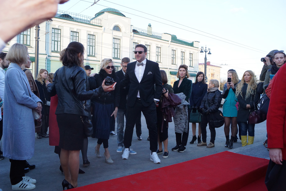 Программный директор «Движения» Стас Тыркин поправляет бабочку на красной дорожке у Омской драмы