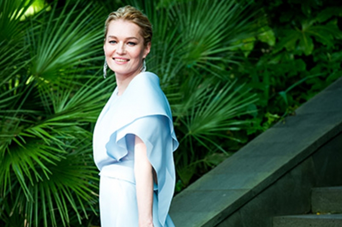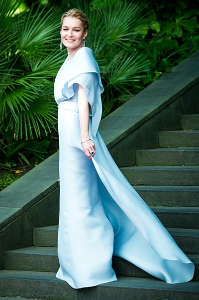 Виктория Толстоганова сделала свою ставку на платье в пол необычного кроя. И не прогадала! Голубой наряд смотрелся на красной дорожке просто восхитительно.