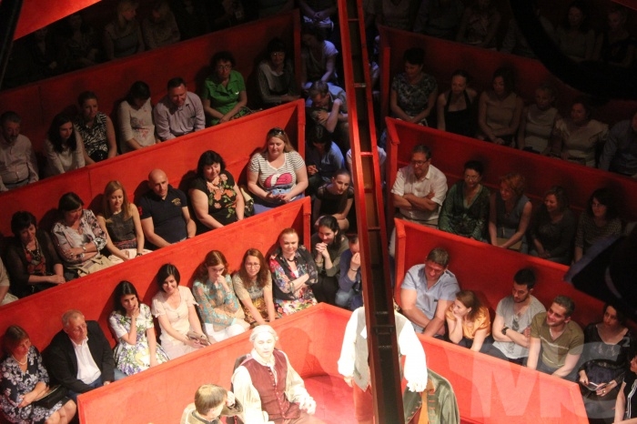 Кстати, спектакль, стоимость посещения которого достигала 3000 рублей, помимо обилеченных зрителей набрал немало представителей творческого Омска, которые на подобные мероприятия обычно проходят по данному им с выбором профессии моральному праву. Специальная конструкция, размещенная на сцене драмтеатра, призвана вместить 140 человек, но вместила почти 200. Многие омские актеры смотрели спектакль, сидя на ступеньках в проходе.