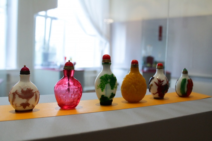 В основном в коллекции Журавлева питейная посуда – то, из чего пили и куда наливали напитки. Но есть и предметы, которые были приобретены, потому что «просто понравились». Это, например, набор китайских флаконов для нюхательной соли. Они имеют интересные формы, некоторые сделаны в технике многослойного стекла.