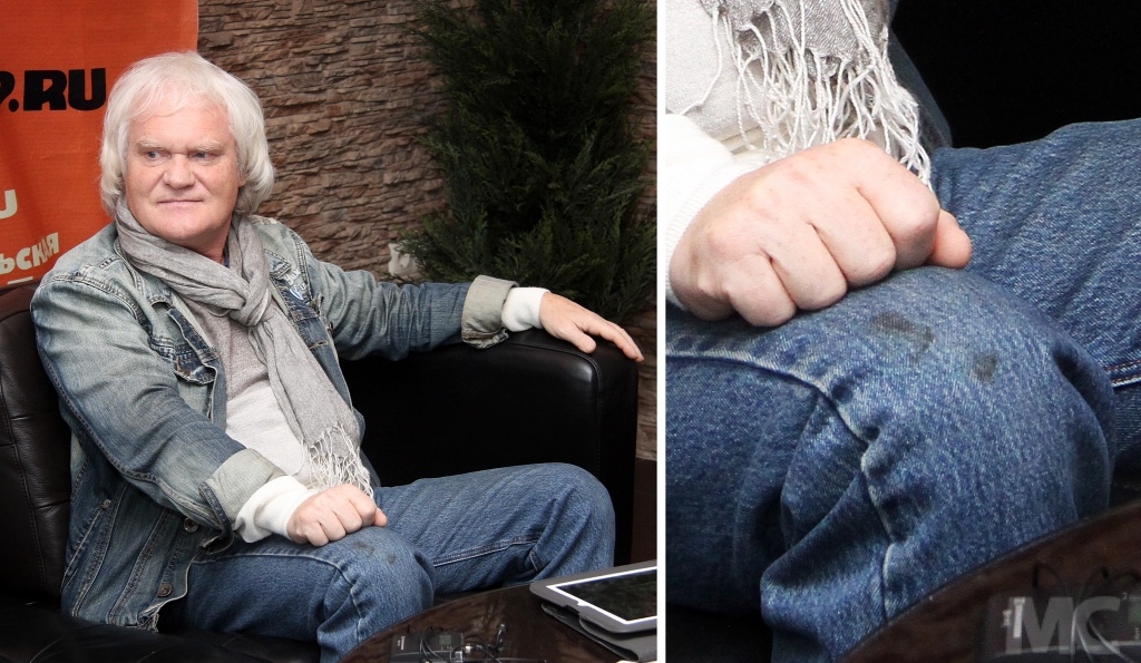 То ли прошедший накануне дождь в нашем городе, то ли подопечные Юрия Дмитриевича постарались, но идеальный джинсовый костюмчик артиста украшал не только шарфик в тон, но и пара темных пятен на джинсах.
