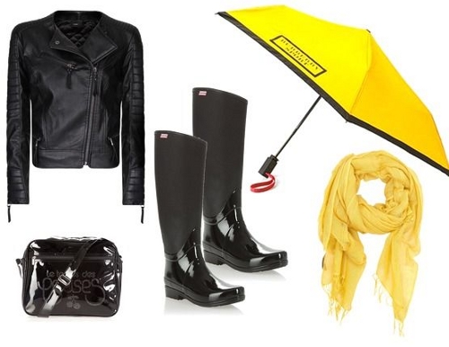 - Кожаную косуху выгодно оттенит яркий зонт желтого цвета и шарф в тон, напоминающие о красках ушедшего лета. Чтобы образ не был слишком скучным и правильным, матовую поверхность куртки можно обыграть лаковой сумкой и сапогами с глянцевыми вставками.