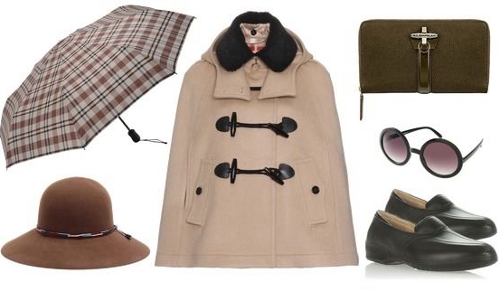 - Классический кейп цвета верблюжьей шерсти прекрасно сочетается с резиновыми сапогами с текстильными вставками шоколадно-бежевой гаммы или с их «младшим братом» - стилизованными под оксфорды или челси калошами. Если на улице солнечно - в комлект органично впишутся очки в круглой оправе. Если же за окном собираются тучи - им на смену придет клетчатый зонт. Завершат образ однотонный клатч натуральных оттенков и шляпа-федора с опущенными вниз полями.
