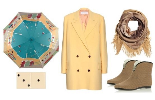 - По-сентябрьски теплый лук, собранный в песочно-желтой гамме, придется по душе смелым и в то же время тонким натурам, предпочитающим классические модели, исполненные в оригинальном цветовом решении. Отделку двубортного пальто можно обыграть клатчем, стилизованным под кость домино. Дополнят образ шелковый шарф с кистями и яркий зонт с контрастным рисунком. К слову, чтобы не перегружать и без того насыщенный деталями комплект, высокие резиновые сапоги лучше заменить на их укороченную версию, которая выглядит несколько изящнее.