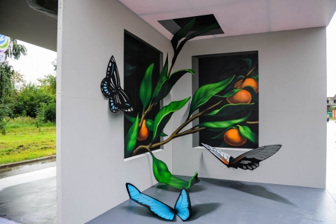 Омские художники Марат ReMarik и Иван Крячко сделали гораздо более весёлым двор детского корпуса больницы №3, расположенной по адресу улица Магистральная, 31. Техническая постройка преобразилась в рамках проекта «Вид из окна».