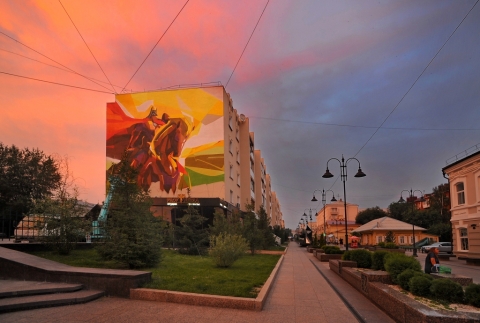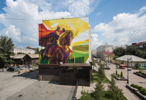 На жилом доме №11 по улице Чокана Валиханова появился яркий киргизский богатырь Манас, подаренный городу художником Константином Zmogk.