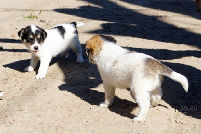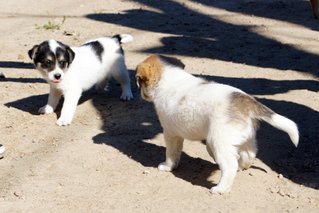 Недавно в собачьей семье произошло пополнение. Молодые сторожевые псы ещё не умеют лаять, но гостей обнюхивали очень тщательно. Периодически делая перерывы на обед.