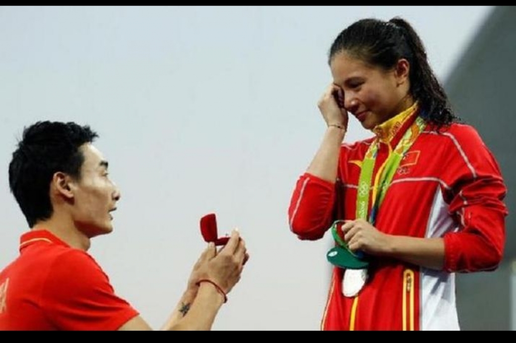 Вчера, 14 августа, в Рио во время церемонии награждения произошло очень трогательное событие: завоевавший бронзу в синхронных прыжках в воду с трамплина Цинь Каи из Китая прямо на пьедестале сделал предложение обладательнице серебряной медали в прыжках в воду с трёхметрового трамплина Хэ Цзы. Та расплакалась и дала согласие.