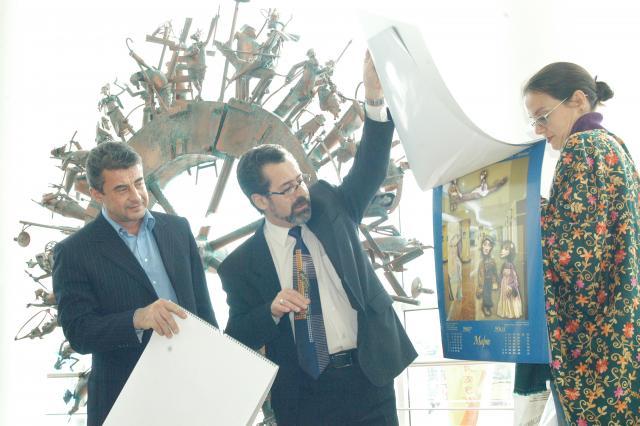 Геннадий Звягинцев как представитель фонда «Меценаты Сибири» вручал театру куклы, актера, маски «Арлекин» скульптуру известного мастера Александра Капралова (2006 год)