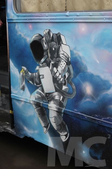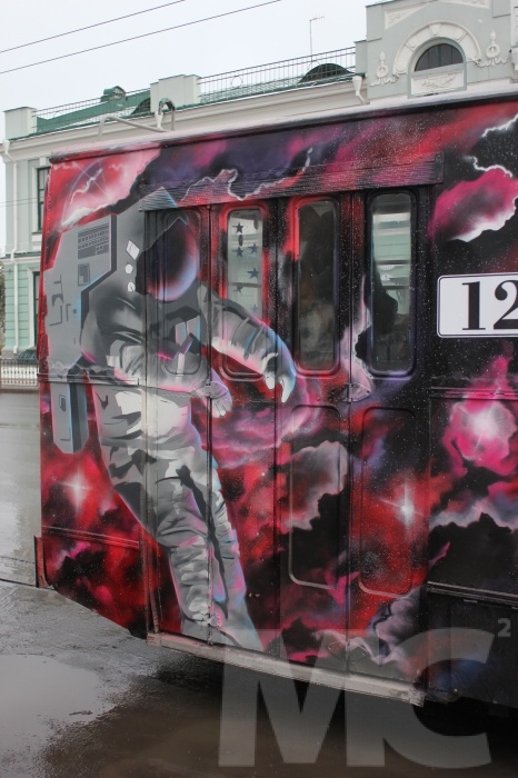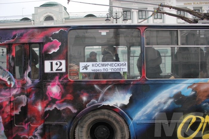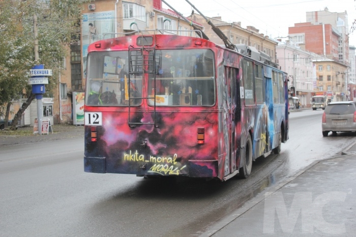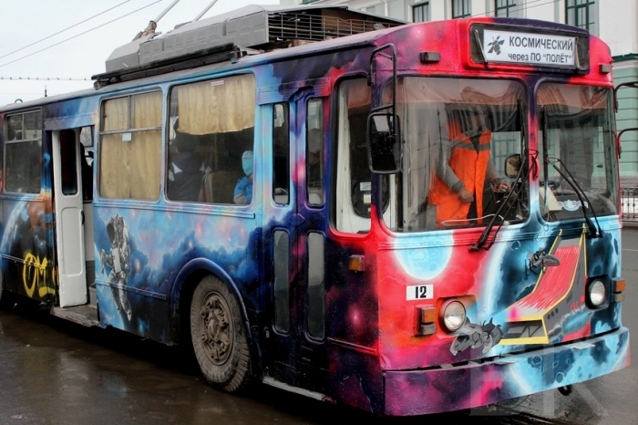 Еще летом художник Никита Абрамов стал победителем конкурса «Космический троллейбус», для которого нужно было подготовить эскиз тематической росписи. Всего на конкурс были представлены работы восьми художников, вариант Никиты омичи сочли лучшим. Накануне город получил в подарок необычный общественный транспорт: троллейбус с росписью, борта которого украсили космонавты, Музыкальный театр и необъятные живописные просторы.