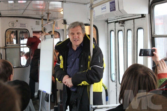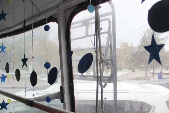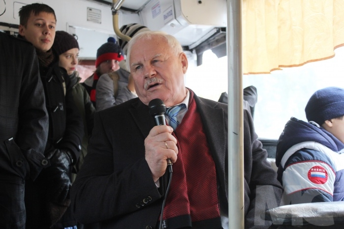 После космической викторины для самых маленьких слово взял руководитель омского планетария Владимир Крупко. Чтобы его голос разнесся по всему троллейбусу, было решено использовать устройство громкой связи водителя с салоном. Правда, оно начало барахлить, и астроном приблизился к народу, но вскоре неполадки были устранены. Троллейбус, тем временем, вышел на маршрут и направился в Чкаловский – правда, по расписанию он должен был вскоре снова прибыть к Драмтеатру.