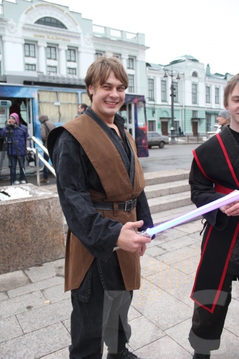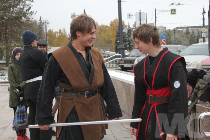 После выступления Юрия Исаулова прошли показательные бои омских саберфайтеров. 73-летний космонавт, который на презентацию «космотролла» пришел с младшим сыном (ему 8 лет), с интересом наблюдал из троллейбуса за битвой на световых мечах.
