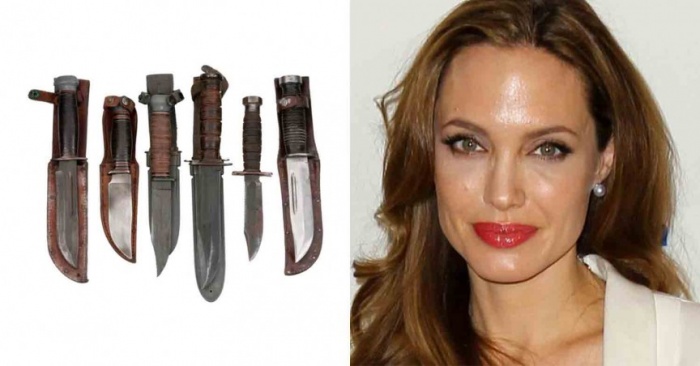 3. А вот у красавицы Анджелины Джоли хобби совсем не женское – с юности она коллекционирует ножи. Особой любовью Анджелины пользуются средневековые кинжалы, но есть в ее собрании и мечи. Женщина, видимо, надеется, что подрастающие дети разделят ее увлечение. Своему старшему сыну Мэддоку актриса купила первый старинный кинжал, когда ему исполнилось семь.