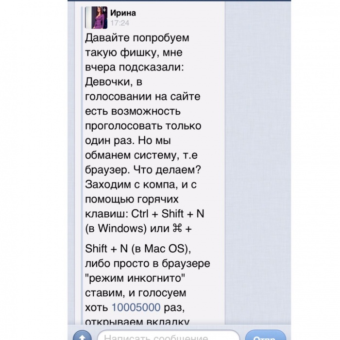 Накрутка голосов – это нарушение режима конкурса. Бывают случаи, когда другие конкурсантки сами накручивают голоса своим конкуренткам, чтобы тех сняли с конкурса, но тут пример агитации людей от самой Ирины Ви.