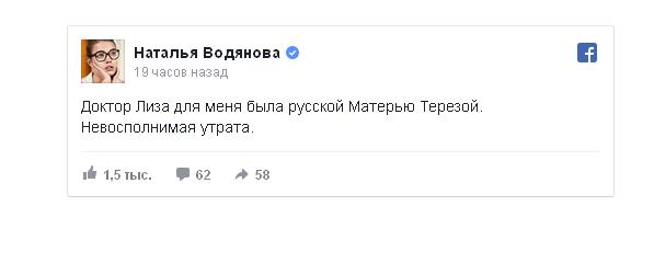 Одной из погибших стала Доктор Лиза – известная благотворительница и правозащитница, исполнительный директор фонда «Справедливая помощь». Именно ее упомянула Наталья Водянова в своем посте.