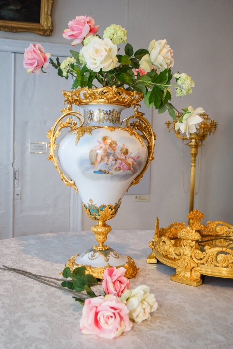 От экскурсовода можно узнать, что особенность этой вазы из молочного стекла в том, что предназначена она не для срезанных цветов и не для того, чтобы просто любоваться ей. Внутри вазы в верхней части есть специальная емкость, чтобы поставить туда горшок с цветущим растением. На стол рядом с вазой можно облокотиться и сделать фото.