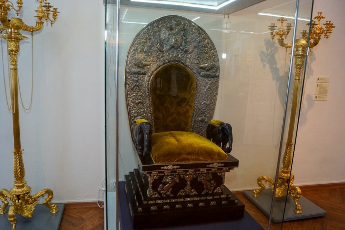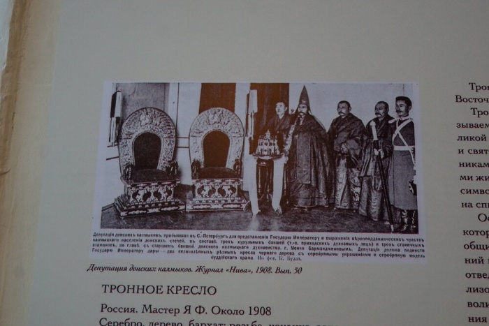 Два таких кресла были подарены делегацией буддистов-калмыков российскому императору и его супруге. Мужское кресло после революции было отправлено в Иркутск и сейчас считается утерянным. А кресло императрицы, на котором сохранилась даже дарственная табличка, можно увидеть на выставке.