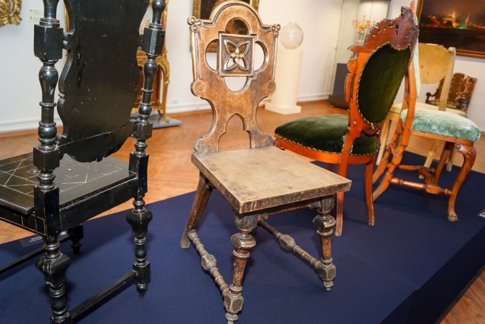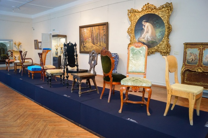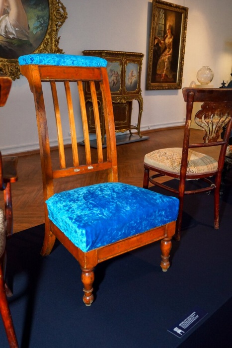 Поскольку выставка посвящена книге Ильфа и Петрова «12 стульев», то без стульев она обойтись просто не могла. Организаторы отобрали самые интересные экземпляры из хранилища. Их 12.